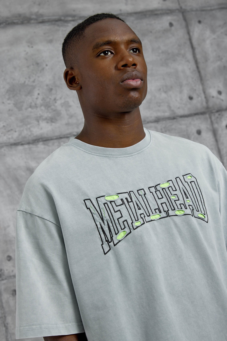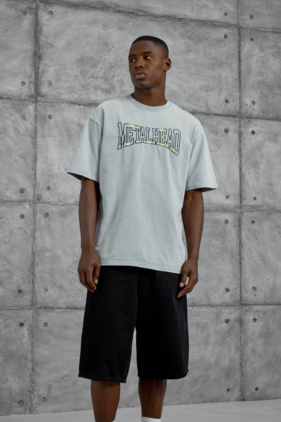 Gri Metalhead Yazılı Yıkamalı Tshirt